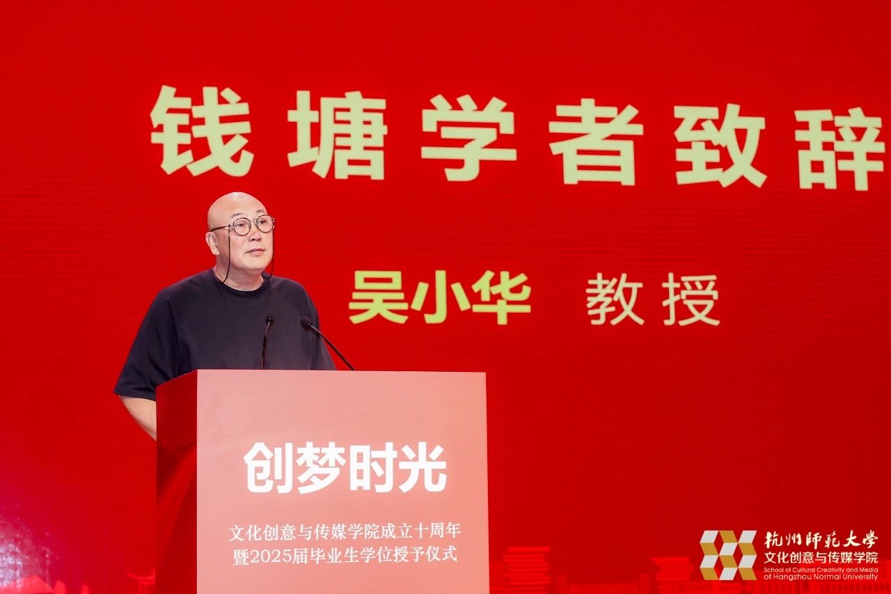 中国美术学院教授、钱塘学者吴小华教授致辞,热烈祝贺杭州师范大学文化创意与传媒学院建院10周年。他表示,十载春秋,学院在学科建设、人才培养、文化传承等方面取得了很多成果,离不开每一位师生的辛勤付出。站在新十年的起点,他寄语学院继续以“服务地方、服务国家战略”为使命,以“守正创新”为指导,为杭州“国际文化创意中心”建设注入活力。
