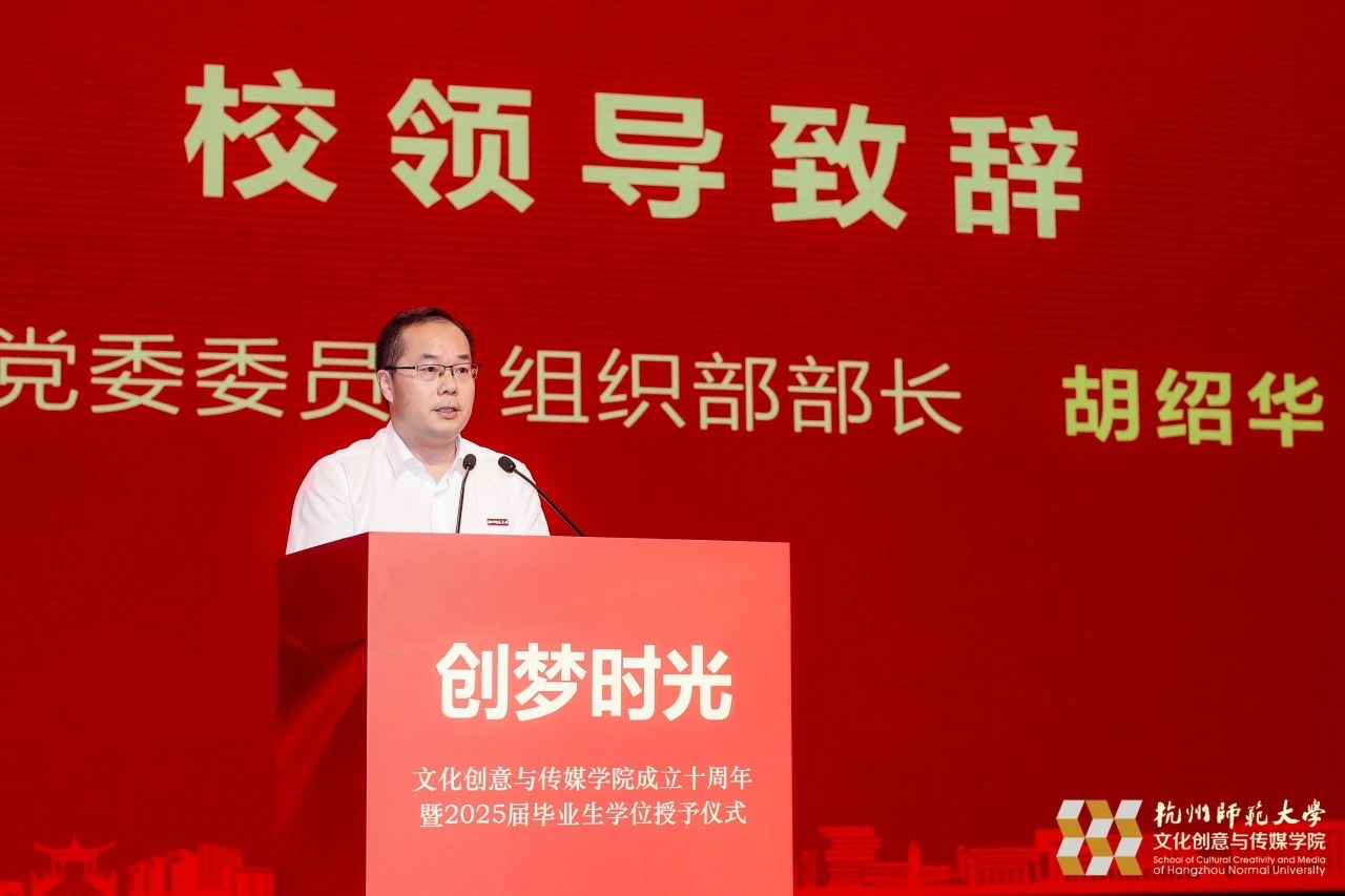 校党委委员、组织部部长胡绍华致辞,他代表学校向文化创意与传媒学院建院10周年致以热烈祝贺与诚挚祝福。他表示,学院坚持以打造全国文化创意产业研究主要阵地、杭州文化创意产业发展关键智库、杭州文创产业人才培养重要基地为建设目标,守初心、抓重点,促改革、强特色,十年来取得了一系列标志性成果,在助力国家经济和社会发展中发挥了重要作用。他对学院的发展提出了三点期望:一是深耕学科沃土,打造特色鲜明的学术高地;二是坚持立德树人,培育德才兼备的文化新人;三是服务地方发展,书写校地融合的崭新篇章。他希望文传学院能够再接再厉、乘势而上,早日建成国内一流、国际知名、特色鲜明的文化创意与传媒教育创新高地!
